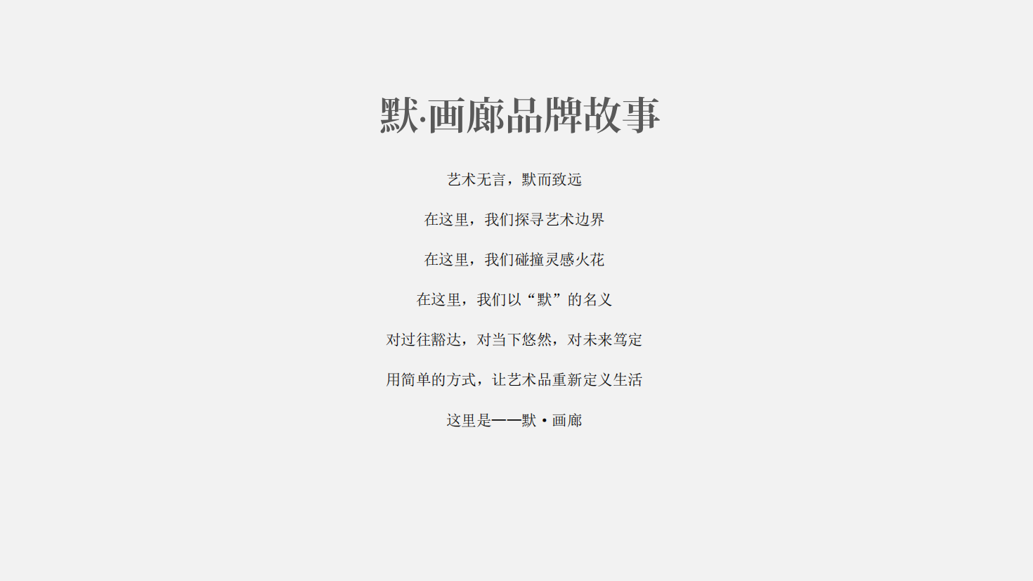 關于“默”的含義,大家第一感覺就是沉默、安靜、無聲。但通過對默畫廊創始人訪談過程中,我們發現“默”其實有著更深層的含義:如今的社會正是快速發展的階段,人們也被快節奏的生活帶得較為浮躁、空洞,難以停下來好好感受生活,便被匆匆忙忙的“趕”到下一個階段,而“默”的意思更多的是表達了一種悠然、豁達、包容......的心境。創始人認為藝術是生活的一部分,每個人應該“默”下來好好欣賞藝術,淡然面對生活,找到過去的初心和未來的方向。七策品牌營銷策劃團隊認為創始人的核心思想,也是品牌資產重要的一部分,需要表達出來。因此,我們提煉了關于“默”的文化內涵。