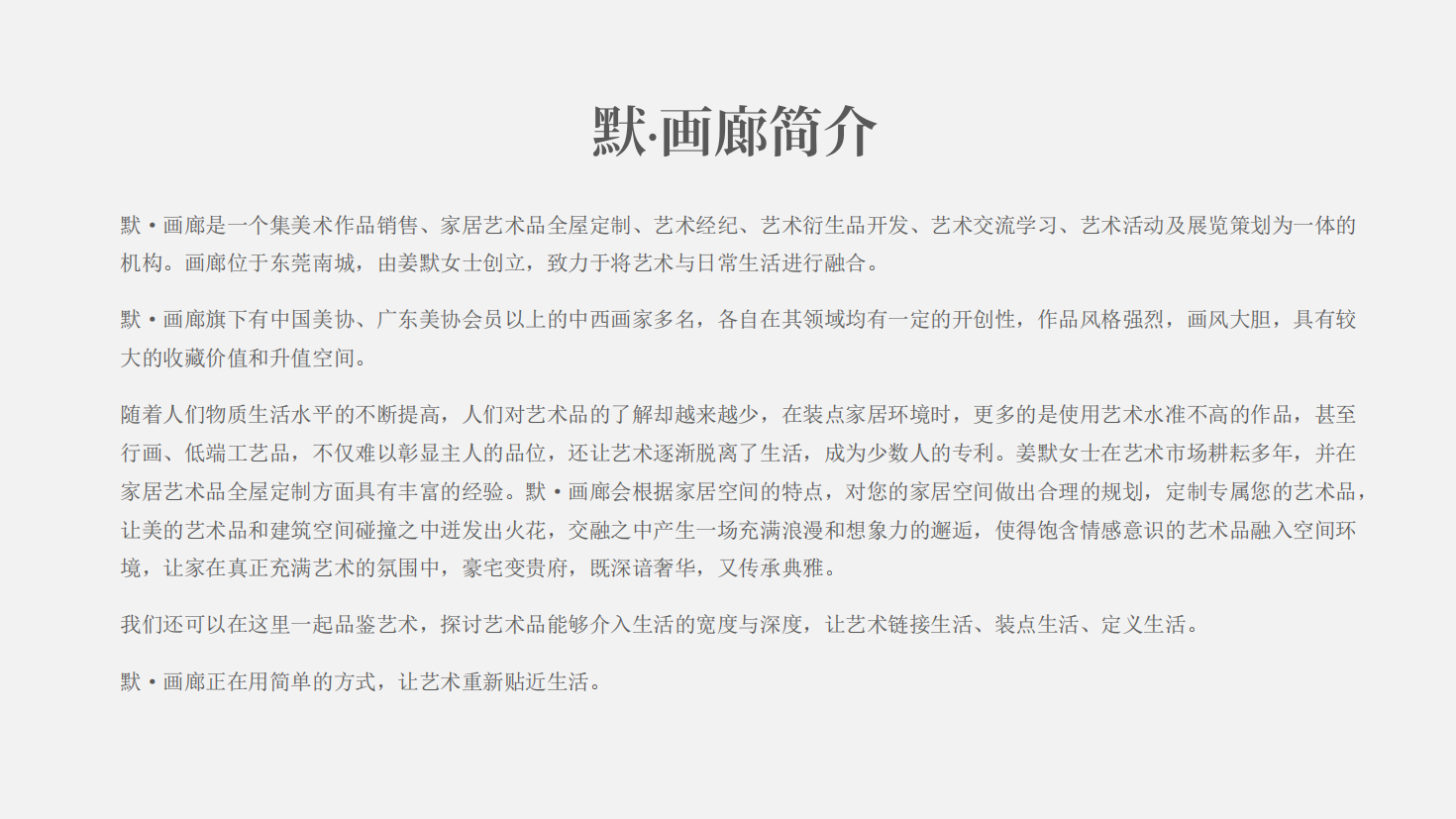 默·畫廊位于東莞南城,由姜默女士創立,致力于將藝術與日常生活進行融合。七策品牌營銷策劃團隊對藝術市場進行深度調研,對自身資源秉賦進行盤點,輸出一系列成果,為默·畫廊品牌的萌芽打下了深厚的基礎,為品牌未來的成長樹立了根本方向。