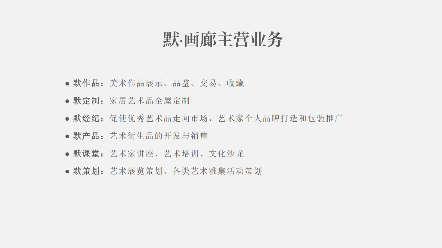 畫廊顧名思義就是展示、收藏和銷售美術品的場所。有些畫廊還銷售一些藝術衍生品,或兼具教育培訓功能。默·畫廊是一個集美術作品銷售、家居藝術品全屋定制、藝術經紀、藝術衍生品開發、 文化藝術交流學習、藝術活動及展覽策劃為一體的機構。